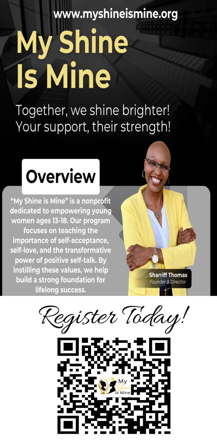 Our mission is to equip and inspire young ladies (ages 13-18) to accept, embrace and share their unique inner shine with the world. We strive to motivate & speak life into young ladies who may or may not be clear on their worth! We will achieve this by offering workshops, seminars, and zoom sessions. As we grow and build, we want to create a mindset that “I am MORE than enough, and my Shine is Mine!"Students and parents will receive information/reminders regarding My Shine is Mine activities & events; because there are times that information and schedules will change. It is imperative that you provide accurate contact information. Our upcoming session dates for Spring 2026 are as follows: January 24th, February 7th, February 21st, March 7th, April 4th, and April 25th.